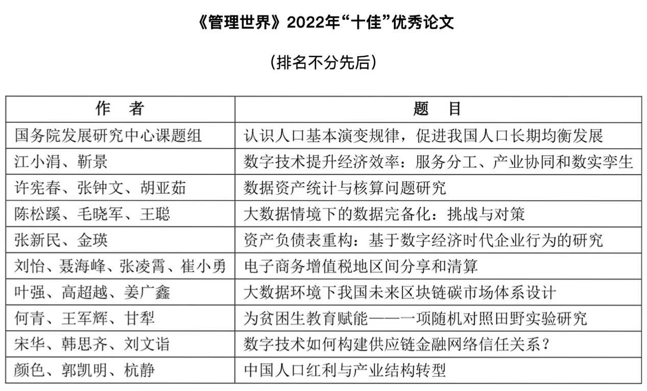 2022年,《管理世界》编辑出版12期,刊发文章181篇。经栏目编辑推荐、编辑部初筛,选出75篇文章,送50位专家进行投票评审。本着客观公正的原则,综合创新性、学术水平、影响力等方面因素,最终评选出2022年“十佳”优秀论文10篇、优秀论文25篇。